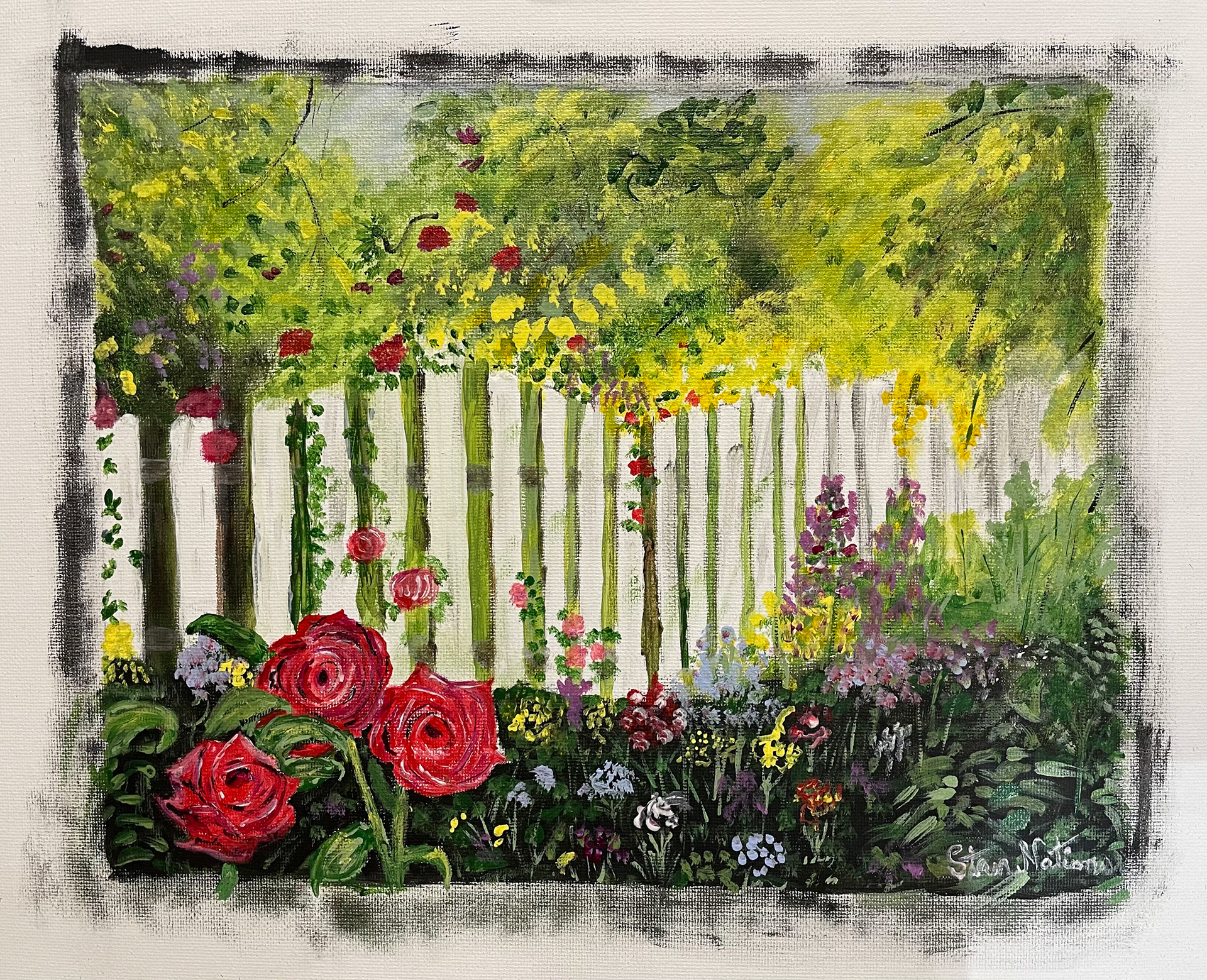 SOLD Fence and Flowers is an 11X14 acrylic on canvas panel which was painted for framing with matting.