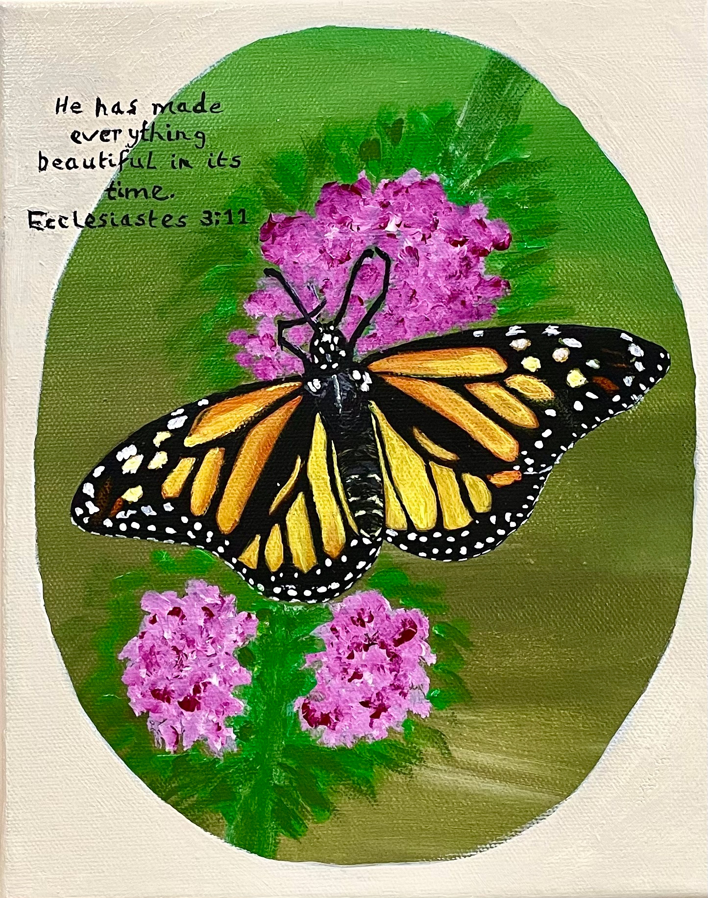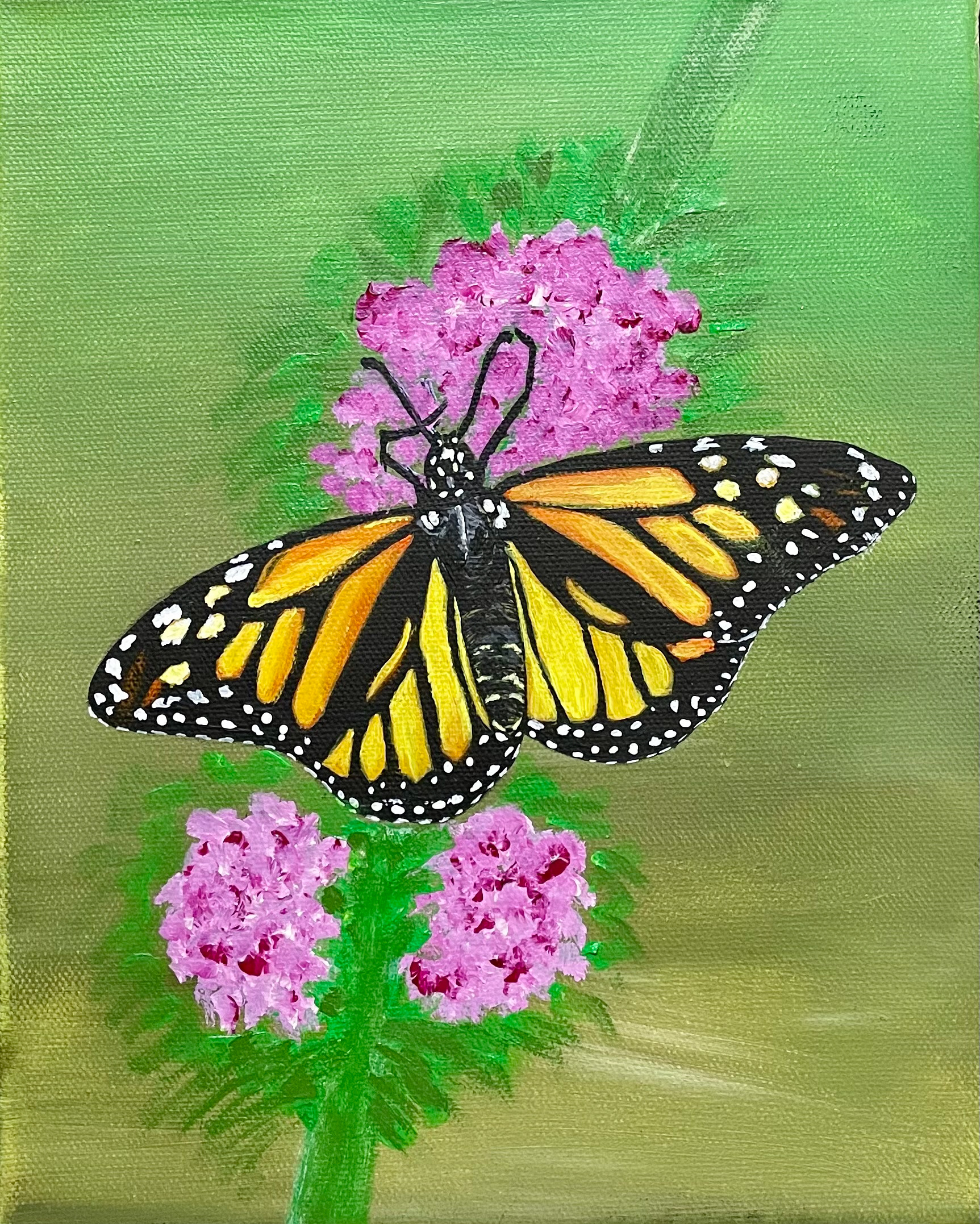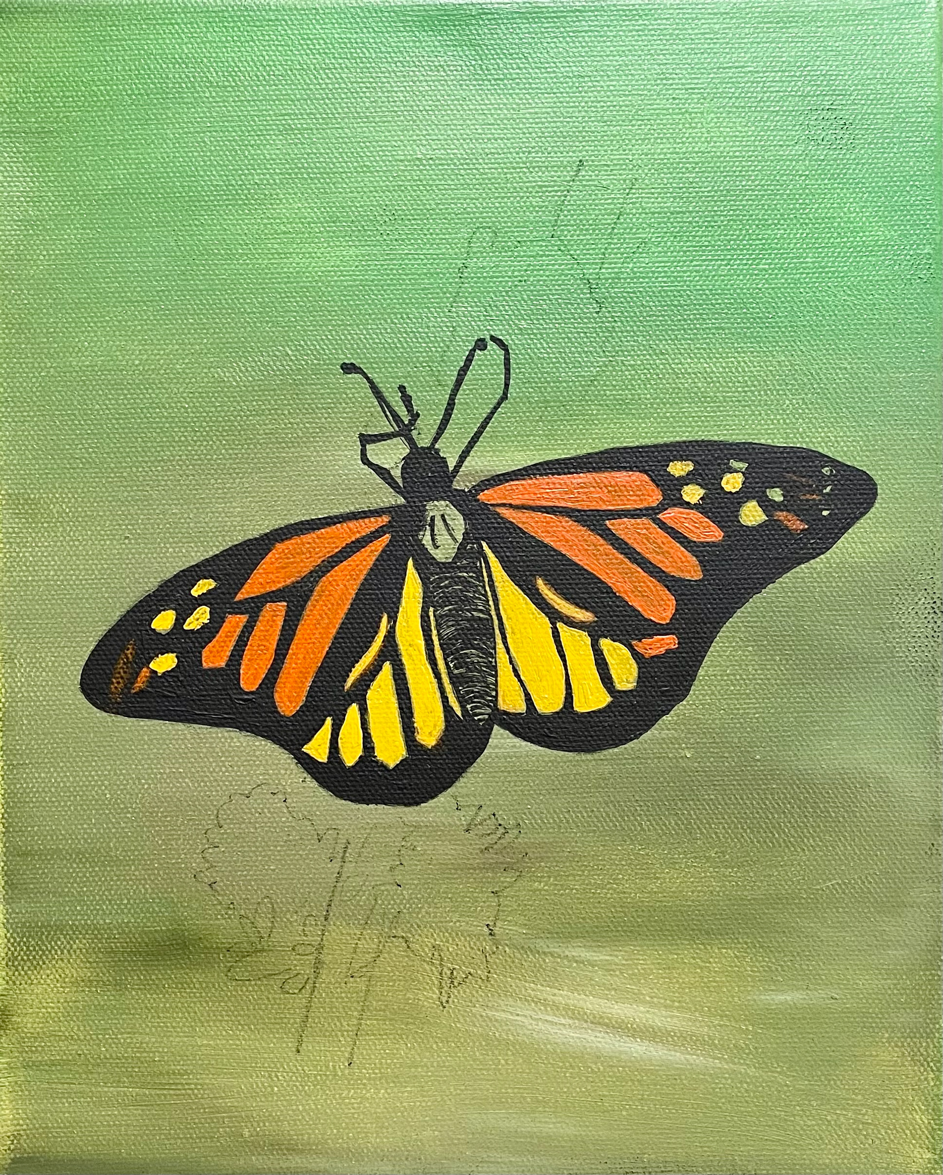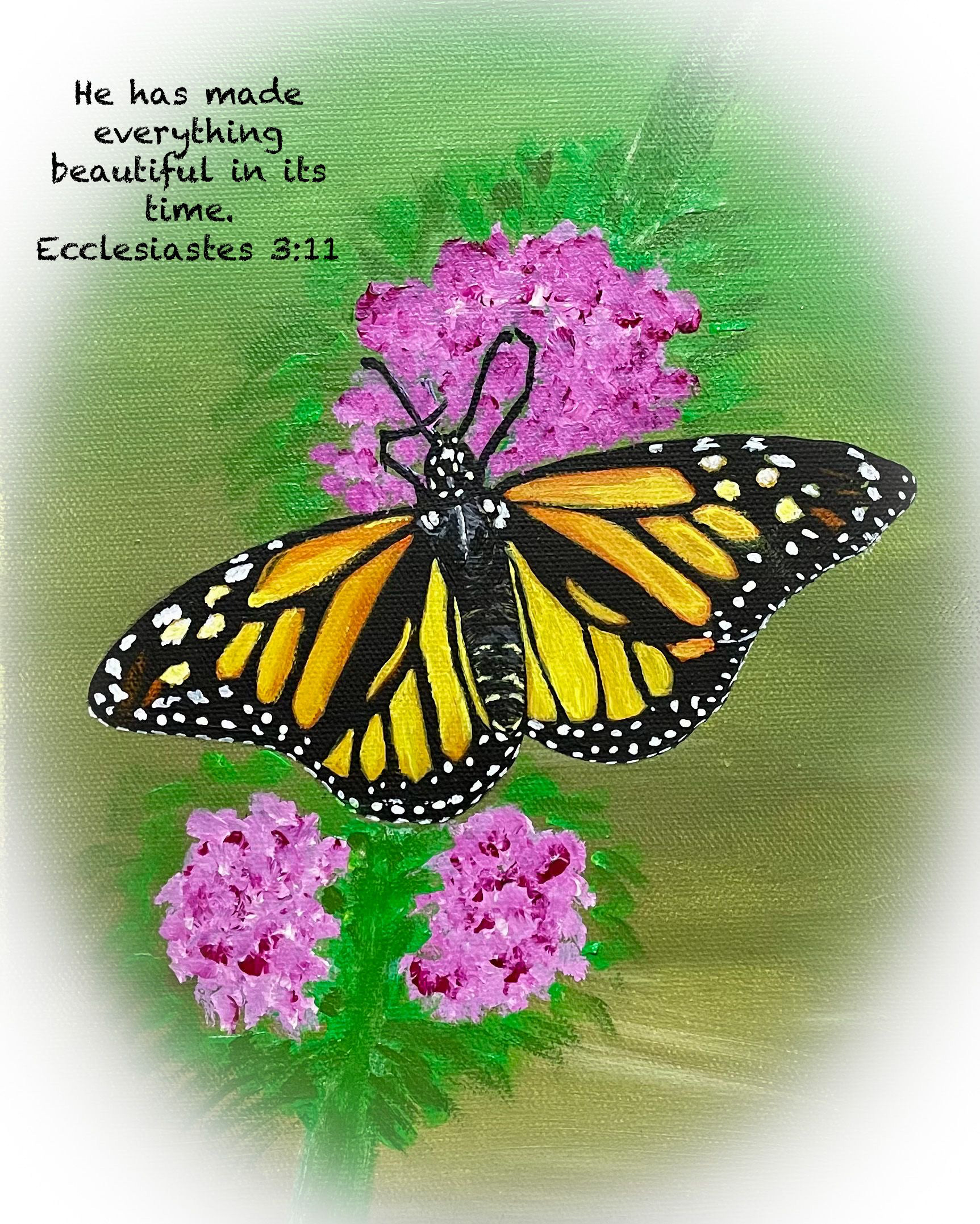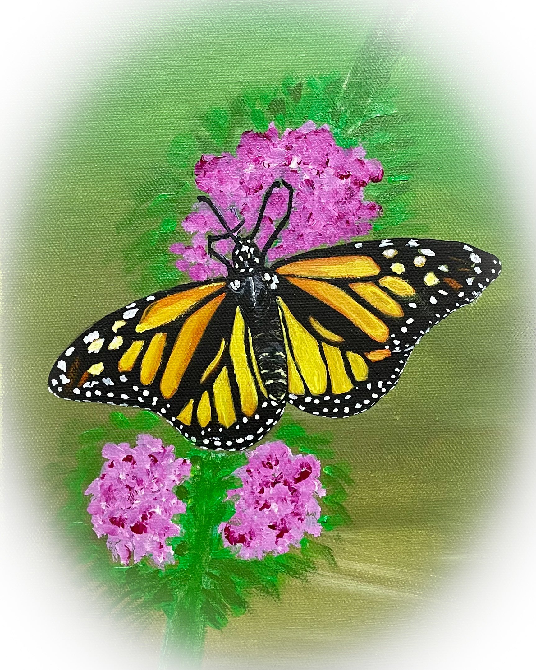 Today’s work, Monarch Butterfly, is an 8X10 Acrylic Painting on Gallery Wrapped Canvas. The first version with vignetting was done digitally using Photoshop. I liked what I saw so the painting was completed today with vignette.