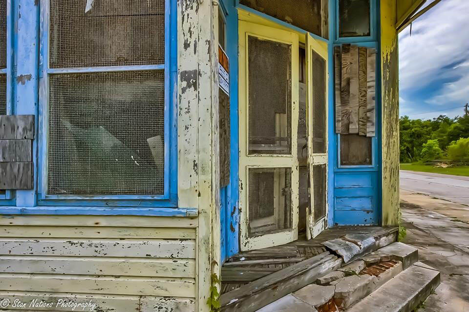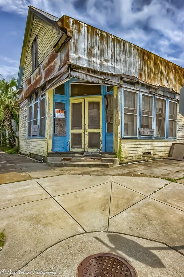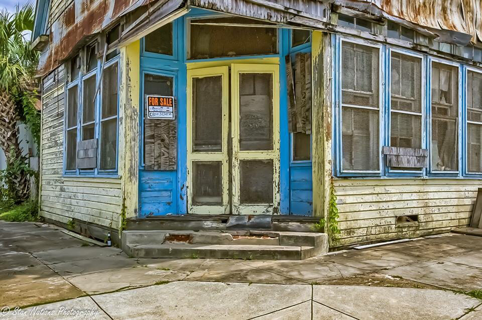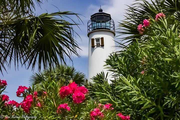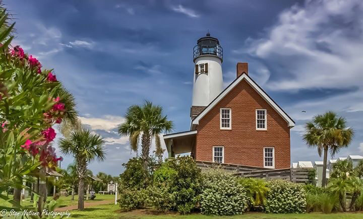 St. George Island Lighthouse and old building in Apalachicola..